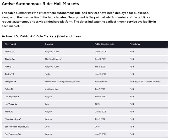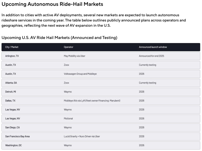 AVs are operating commercially today in cities like Atlanta, Austin, Los Angeles, Phoenix, and San Francisco. These markets provide early indicators of how autonomous services from pilot programs to limited public robotaxi services interact with existing rideshare ecosystems.
