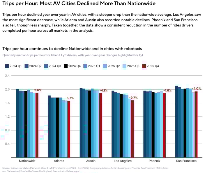 Gridwise found that in Q4 2025, trips per hour fell by approximately 5.3% in AV markets, compared with a 2.6% decline nationwide. In Los Angeles, the decline was especially pronounced, nearing a 10% year-over-year drop.
