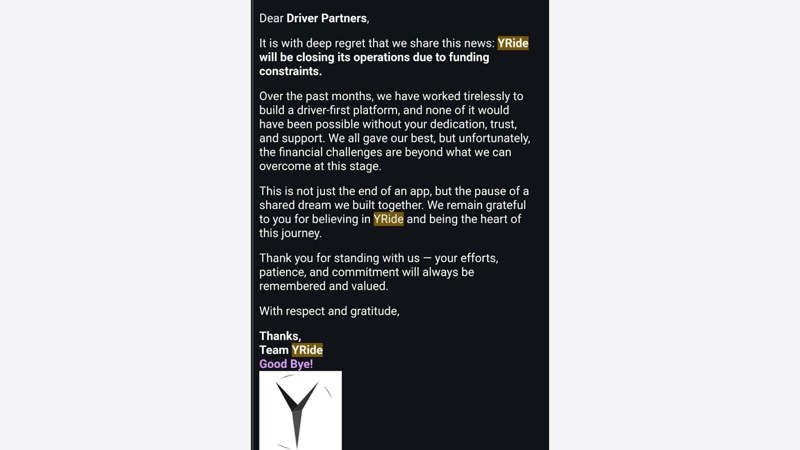 YRide, a driver-first rideshare platform that promised zero commission and 100% fare retention for drivers, announced it is closing operations due to insurmountable funding constraints. The company shared the news with its driver partners, expressing “deep regret” and acknowledging that despite tireless efforts to build an alternative to Uber and Lyft, financial challenges proved too difficult to overcome at this stage.